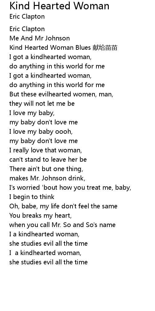 | [00:04.16] | Kind Hearted Woman Blues 献给苗苗 |