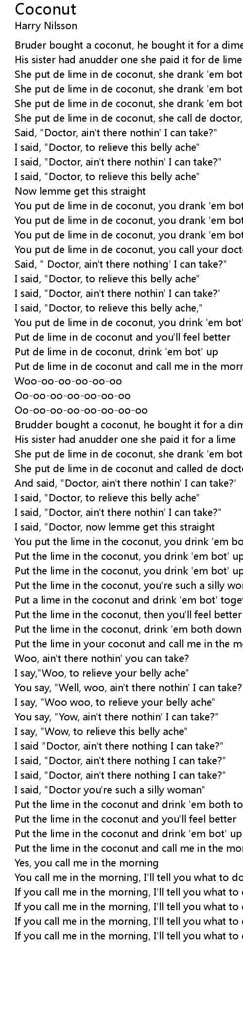She put de lime in de coconut and called de doctor, woke 'im up |