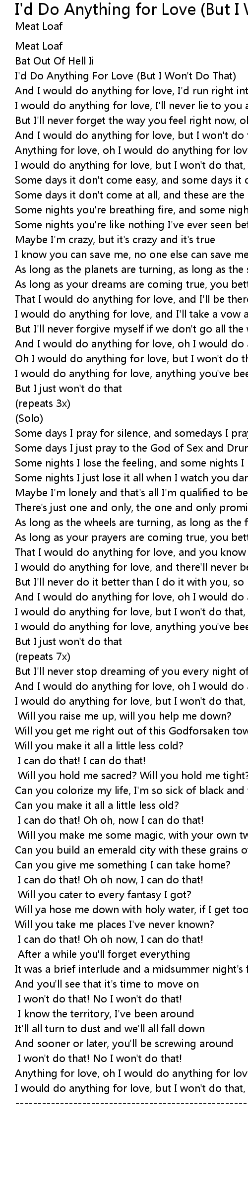 I would do anything for love, but I won't do that, no no no I won't do that |