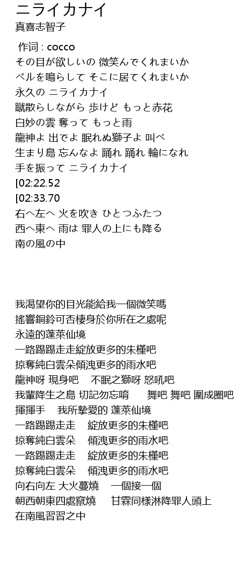 | [03:31.71][02:22.52] | 蹴散らしながら 歩けど もっと赤花 |