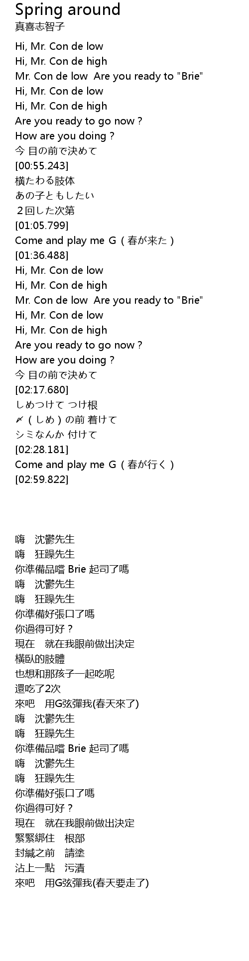 | [00:30.633] | Mr. Con de low Are you ready to "Brie" |