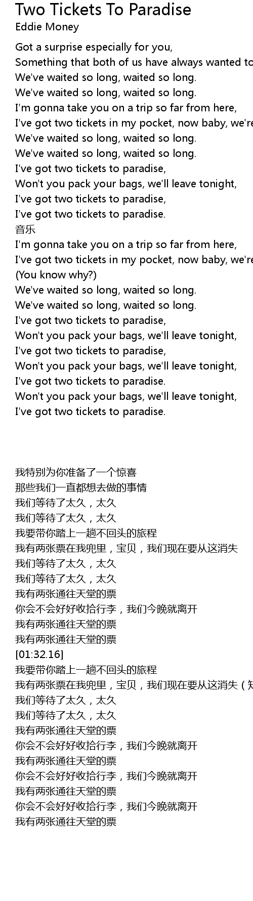 | [01:25.96] | I've got two tickets to paradise. |