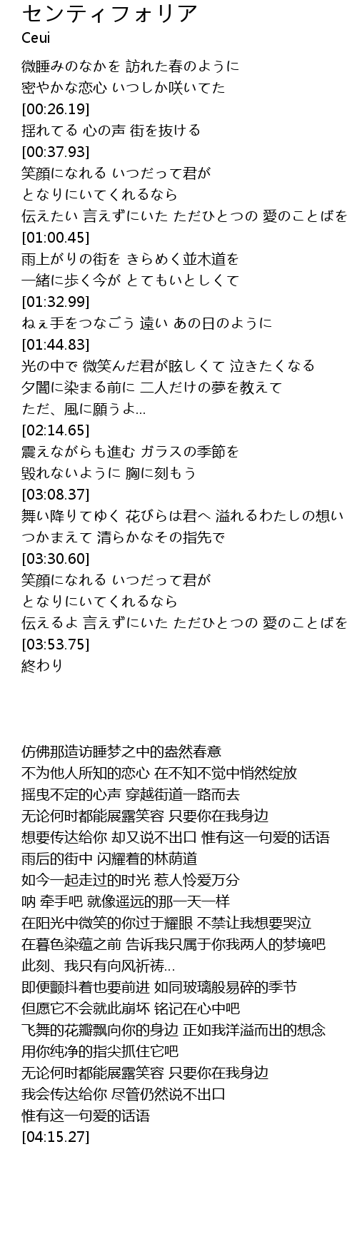 | [03:11.18] | 舞い降りてゆく 花びらは君へ 溢れるわたしの想い |