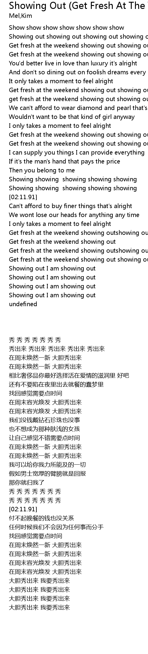 | [01:31.91] | Get fresh at the weekend showing out showing out |