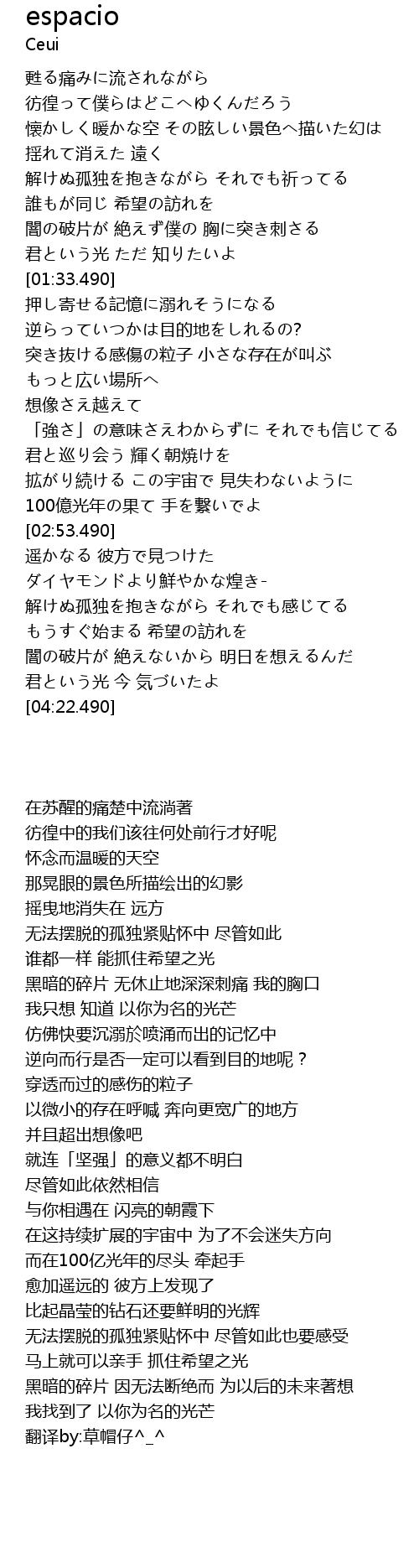 | [02:39.490] | 拡がり続ける この宇宙で 見失わないように |
