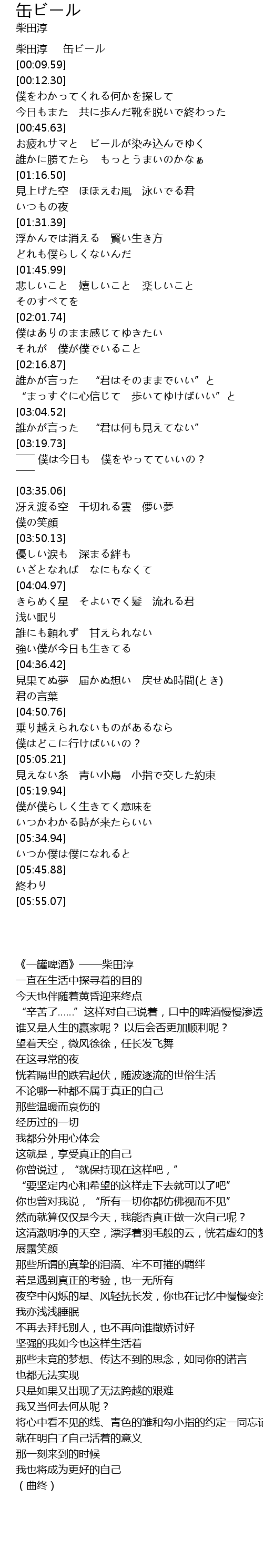 | [00:46.61] | お疲れサマと ビールが染み込んでゆく |