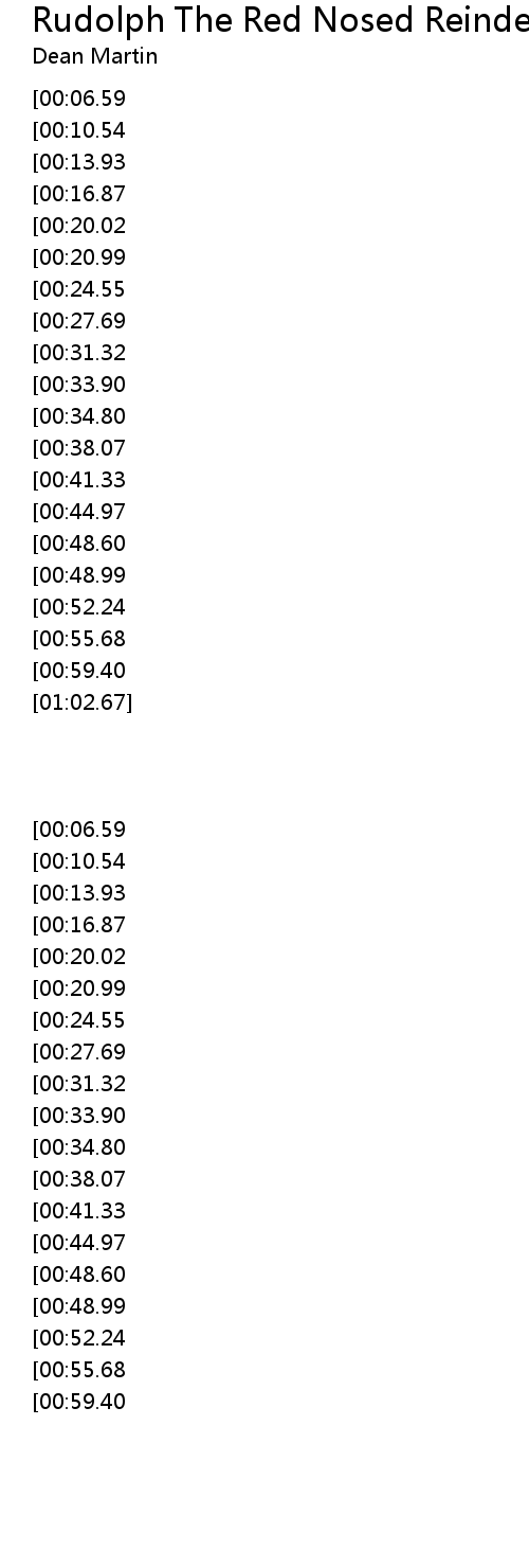 | [01:02.94][00:06.59] | Rudolph the rednosed reindeer |