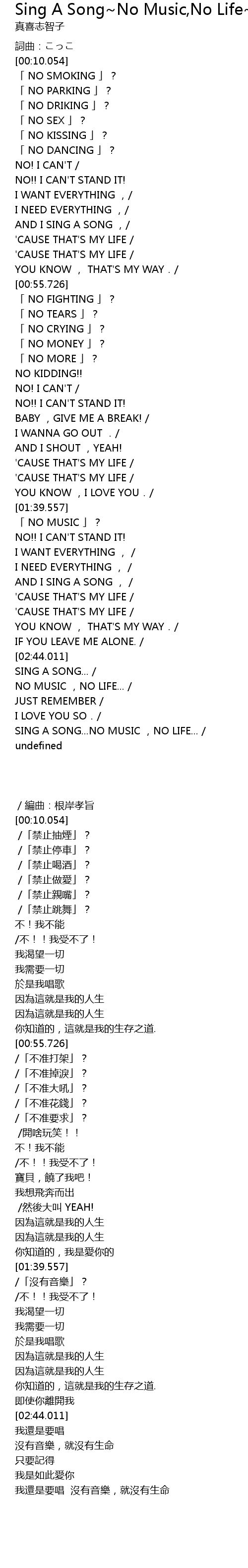 | [03:41.352] | SING A SONG...NO MUSIC ,NO LIFE... / |