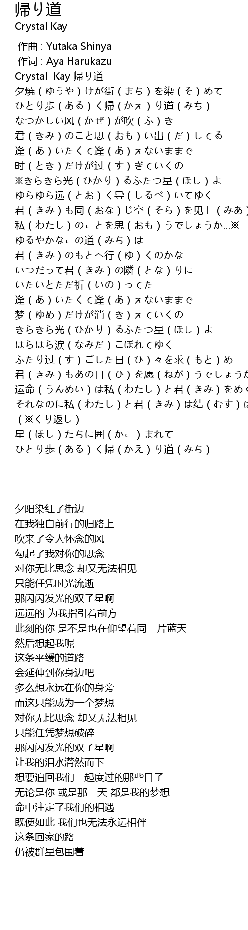 | [00:31.519] | ひとり歩(ある)く帰(かえ)り道(みち) |