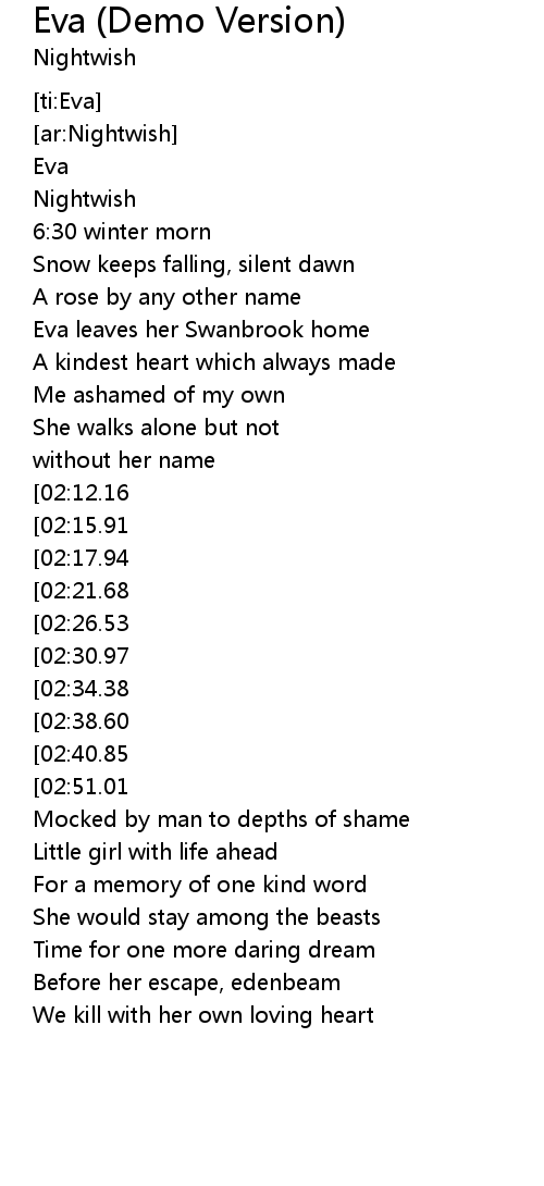 | [00:56.43][02:12.16][03:28.36] | Eva flies away |