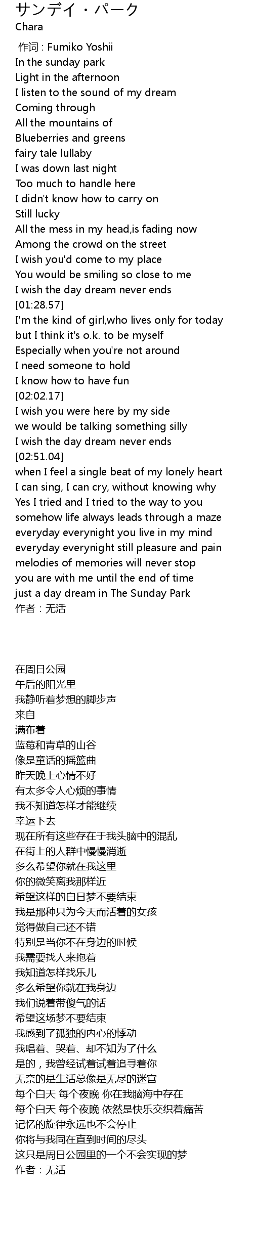 | [00:15.60] | In the sunday park |