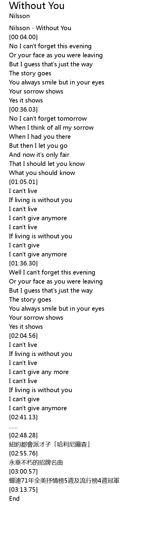 | [03:00.91] | 蟬連71年全美抒情榜5週及流行榜4週冠軍 |