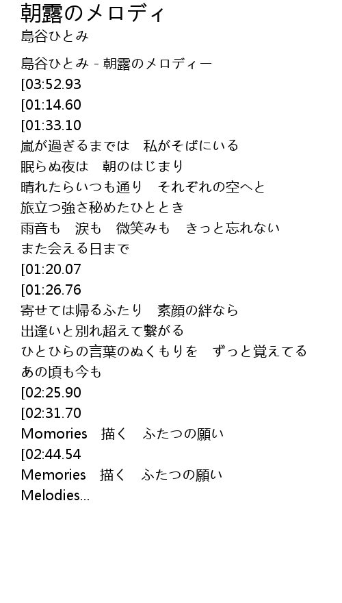 | [00:00.00] | 島谷ひとみ - 朝露のメロディー |