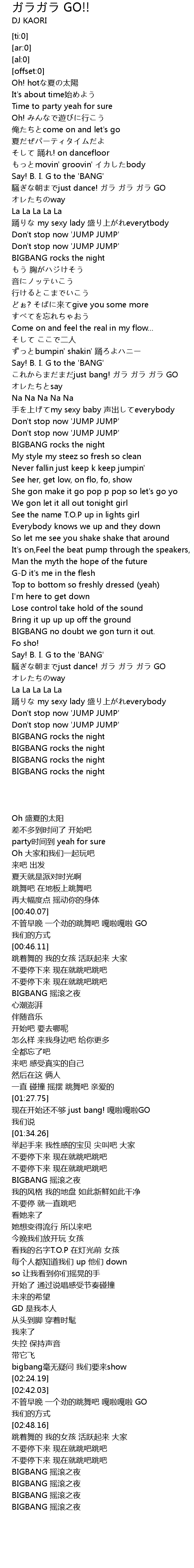 | [00:42.38] | 騒ぎな朝までjust dance! ガラ ガラ ガラ GO |