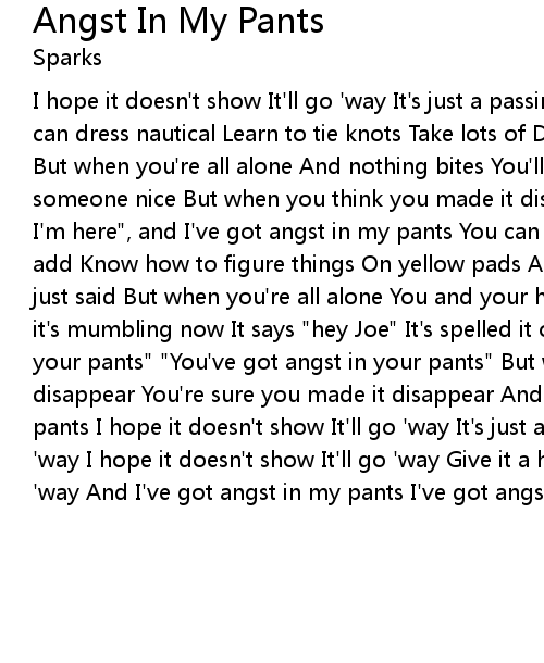 I hope it doesn't show It'll go 'way It's just a passing phase It'll go 'way You can dress nautical Learn to tie knots Take lots of Dramamine Out on your yacht But when you're all alone And nothing bites You'll wish you stayed at home With someone nice But when you think you made it disappear It comes again, "Hello, I'm here", and I've got angst in my pants You can be smart as hell Know how to add Know how to figure things On yellow pads Answer so no one knows What you just said But when you're all alone You and your head What's the computer say, it's mumbling now It says "hey Joe" It's spelled it out and "You've got angst in your pants" "You've got angst in your pants" But when you think you've made it disappear You're sure you made it disappear And you've still got angst in your pants I hope it doesn't show It'll go 'way It's just a passing phase It'll go 'way I hope it doesn't show It'll go 'way Give it a hundred years It won't go 'way And I've got angst in my pants I've got angst in my pants |