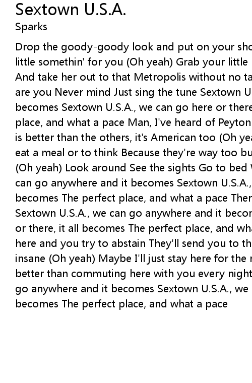 Drop the goody-goody look and put on your shoes Because I'm gonna recommend a little somethin' for you (Oh yeah) Grab your little Lulu or your Sally or Sue And take her out to that Metropolis without no taboos (Oh yeah) What you say Who are you Never mind Just sing the tune Sextown U.S.A., we can go anywhere and it becomes Sextown U.S.A., we can go here or there, it all becomes The perfect place, and what a pace Man, I've heard of Peyton Place and Pigalle too But this is better than the others, it's American too (Oh yeah) No one has the time to eat a meal or to think Because they're way too busy doin' Kama Sutra-y things (Oh yeah) Look around See the sights Go to bed What a life Sextown U.S.A., we can go anywhere and it becomes Sextown U.S.A., we can go here or there, it all becomes The perfect place, and what a pace There's a whole lotta fish in the sea Sextown U.S.A., we can go anywhere and it becomes Sextown U.S.A., we can go here or there, it all becomes The perfect place, and what a pace If you try to come here and you try to abstain They'll send you to the prison for the criminally insane (Oh yeah) Maybe I'll just stay here for the rest of my life Because it's better than commuting here with you every night (Oh yeah) Sextown U.S.A., we can go anywhere and it becomes Sextown U.S.A., we can go here or there, it all becomes The perfect place, and what a pace |