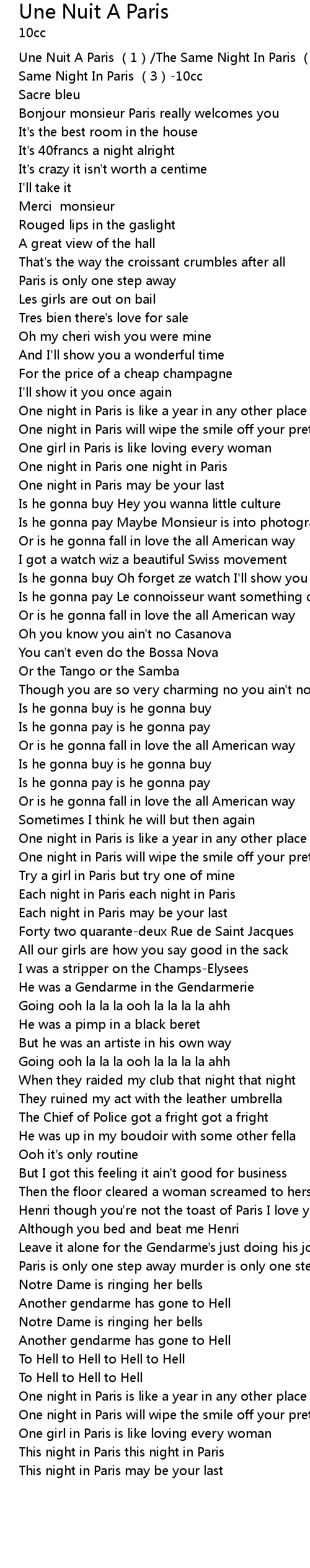 | [00:00.00] | Une Nuit A Paris 1 The Same Night In Paris 2 Later The Same Night In Paris 3 10cc |