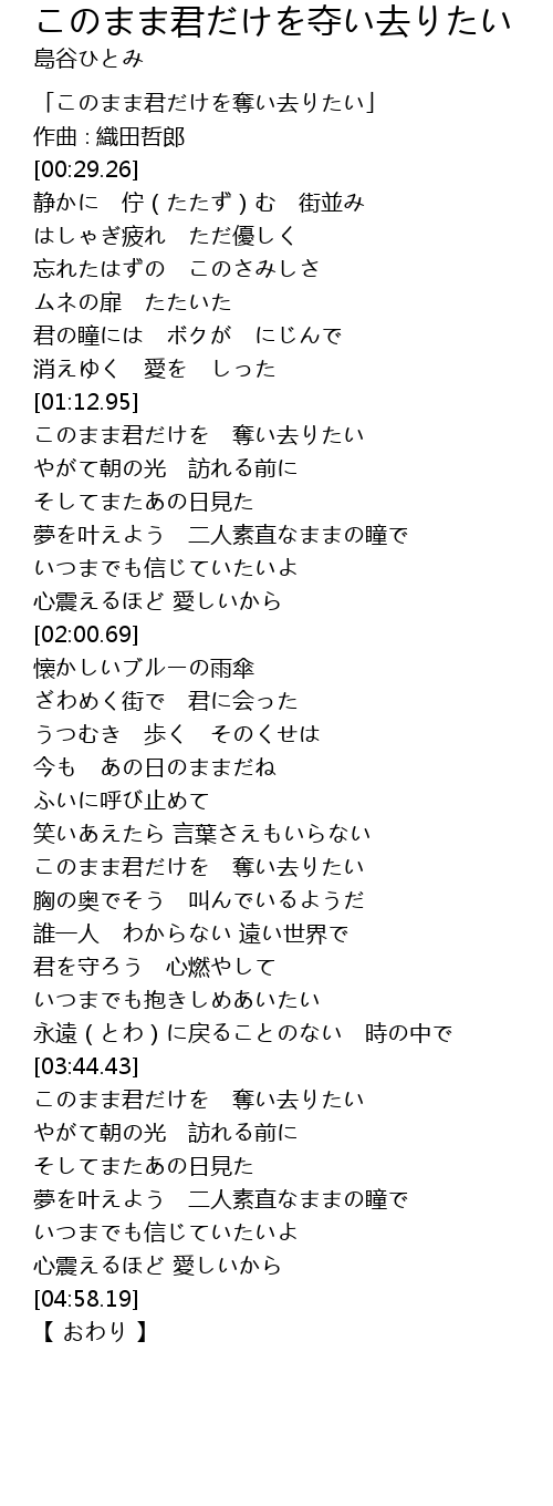 | [02:57.92] | このまま君だけを 奪い去りたい |