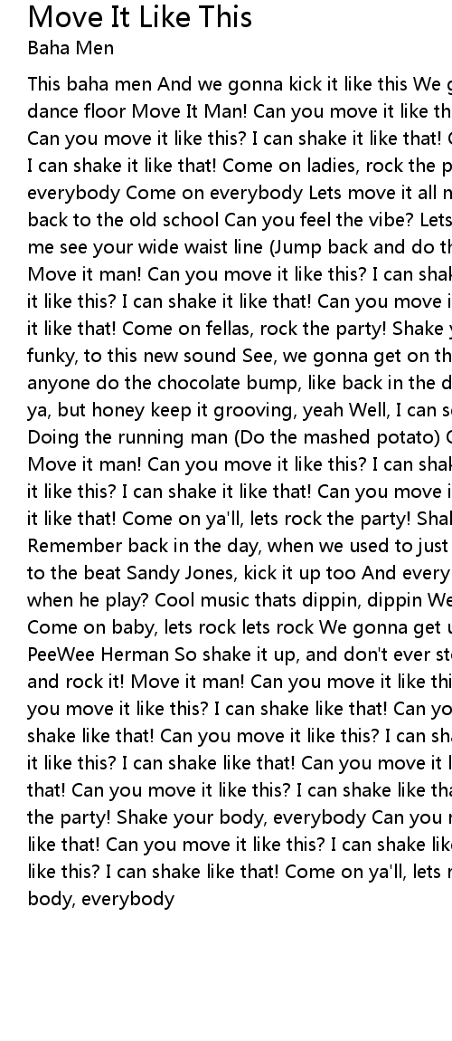 This baha men And we gonna kick it like this We gonna keep it movin' From the dance floor Move It Man! Can you move it like this? I can shake it like that! Can you move it like this? I can shake it like that! Can you move it like this? I can shake it like that! Come on ladies, rock the party! Shake ya body, everybody Come on everybody Lets move it all night Uh, Uh huh Gonna take you back to the old school Can you feel the vibe? Lets dance to the rhythm And let me see your wide waist line (Jump back and do the twist) And the electric slide Move it man! Can you move it like this? I can shake it like that! Can you move it like this? I can shake it like that! Can you move it like this? I can shake it like that! Come on fellas, rock the party! Shake ya body, everybody Lets get funky, to this new sound See, we gonna get on the floor and do it like that Can anyone do the chocolate bump, like back in the day? We thought we'd bring it to ya, but honey keep it grooving, yeah Well, I can see everyone on the dance floor Doing the running man (Do the mashed potato) Or walk the feeling out if you can Move it man! Can you move it like this? I can shake it like that! Can you move it like this? I can shake it like that! Can you move it like this? I can shake it like that! Come on ya'll, lets rock the party! Shake ya body, everybody Remember back in the day, when we used to just do the boogaloo? Everybody rocks to the beat Sandy Jones, kick it up too And everybody runs together Where the DJ when he play? Cool music thats dippin, dippin We kick back and we keep dippin Come on baby, lets rock lets rock We gonna get up on the dance floor and do the PeeWee Herman So shake it up, and don't ever stop! (Do the robot) And baby go and rock it! Move it man! Can you move it like this? I can shake like that! Can you move it like this? I can shake like that! Can you move it like this? I can shake like that! Can you move it like this? I can shake like that! Can you move it like this? I can shake like that! Can you move it like this? I can shake like that! Can you move it like this? I can shake like that! Come on ya'll, lets rock the party! Shake your body, everybody Can you move it like this? I can shake like that! Can you move it like this? I can shake like that! Can you move it like this? I can shake like that! Come on ya'll, lets rock the party! Shake your body, everybody |