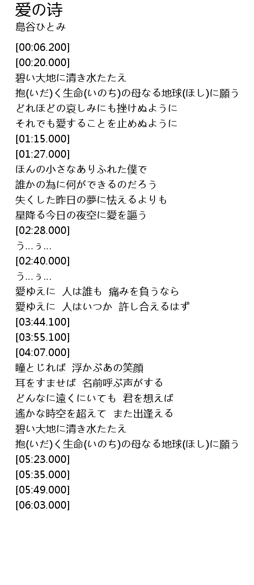 | [00:38.000] | 抱(いだ)く生命(いのち)の母なる地球(ほし)に願う |