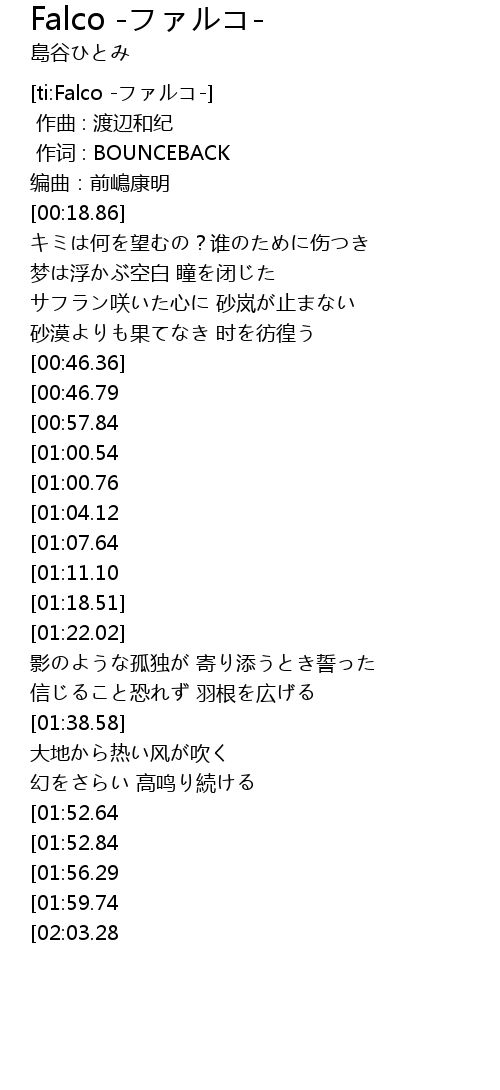 | [02:41.51][01:00.76] | 未来その手に 飞び立つFalco |