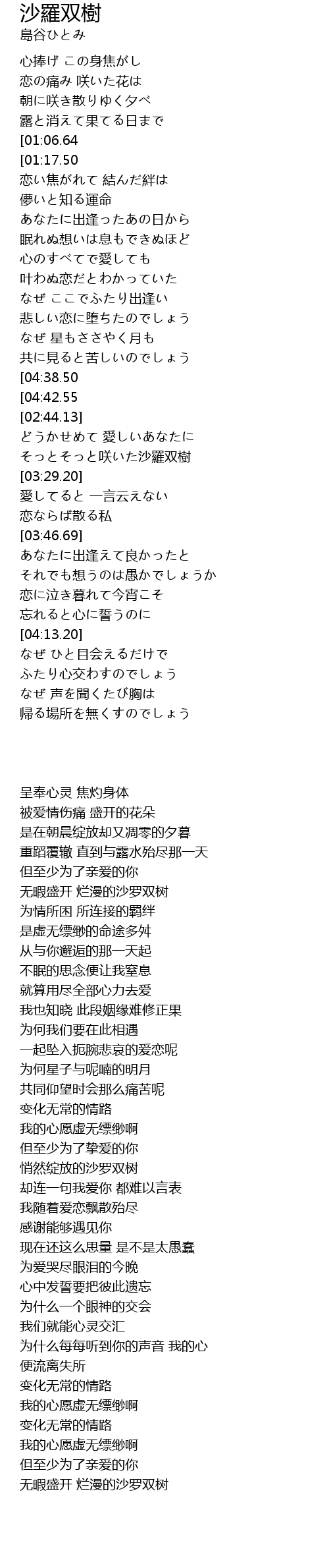 | [05:08.22][01:17.50] | 白く白く咲いた沙羅双樹 |