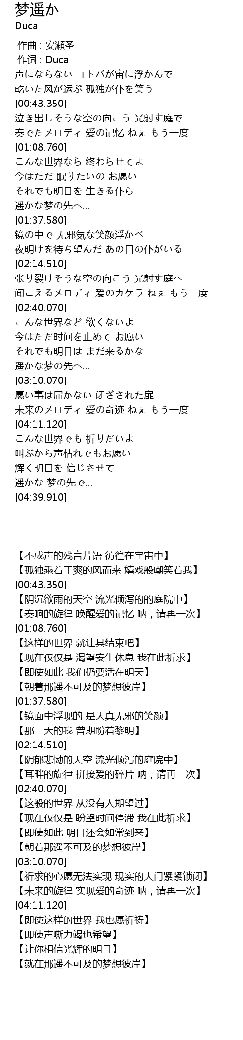 | [04:31.010] | 遥かな 梦の先で… |
