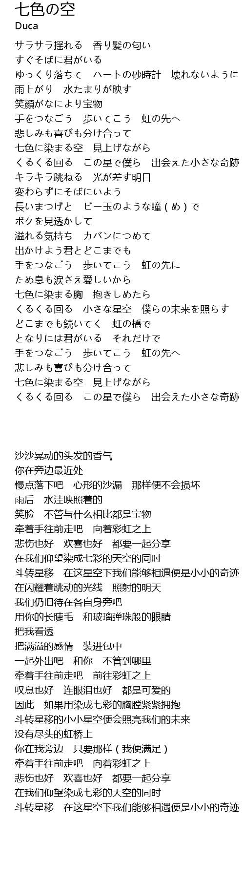 | [01:02.50] | 七色に染まる空 見上げながら |