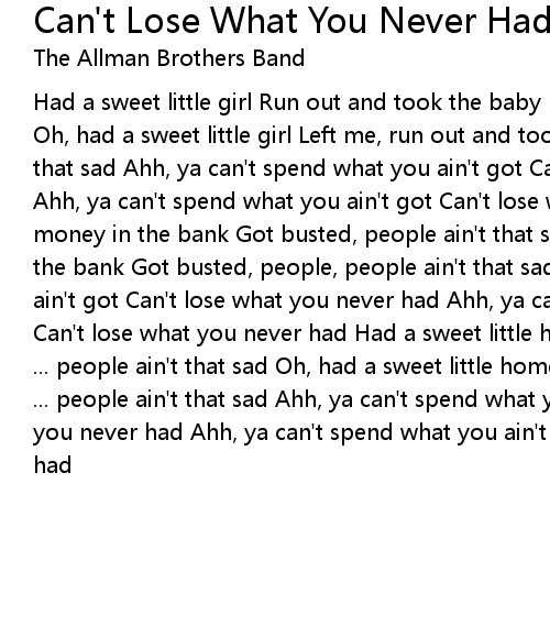 Had a sweet little girl Run out and took the baby boy ... people ain't that sad Oh, had a sweet little girl Left me, run out and took the baby boy ... ain't that sad Ahh, ya can't spend what you ain't got Can't lose what you never had Ahh, ya can't spend what you ain't got Can't lose what you never had Had some money in the bank Got busted, people ain't that so sad Oh, I had some money in the bank Got busted, people, people ain't that sad Ahh, ya can't spend what you ain't got Can't lose what you never had Ahh, ya can't spend what you ain't got Can't lose what you never had Had a sweet little home Got drunk, burned it down ... people ain't that sad Oh, had a sweet little home Got drunk, burned it down ... people ain't that sad Ahh, ya can't spend what you ain't got Can't lose what you never had Ahh, ya can't spend what you ain't got Can't lose what you never had |