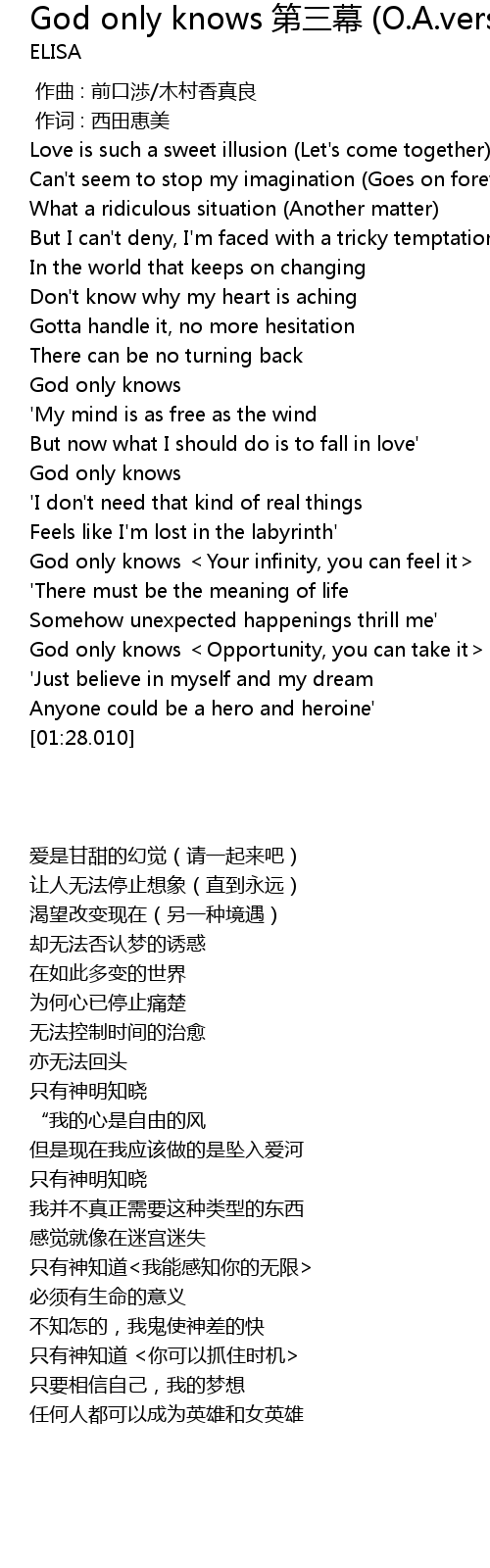 | [01:13.380] | God only knows <Your infinity, you can feel it> |
