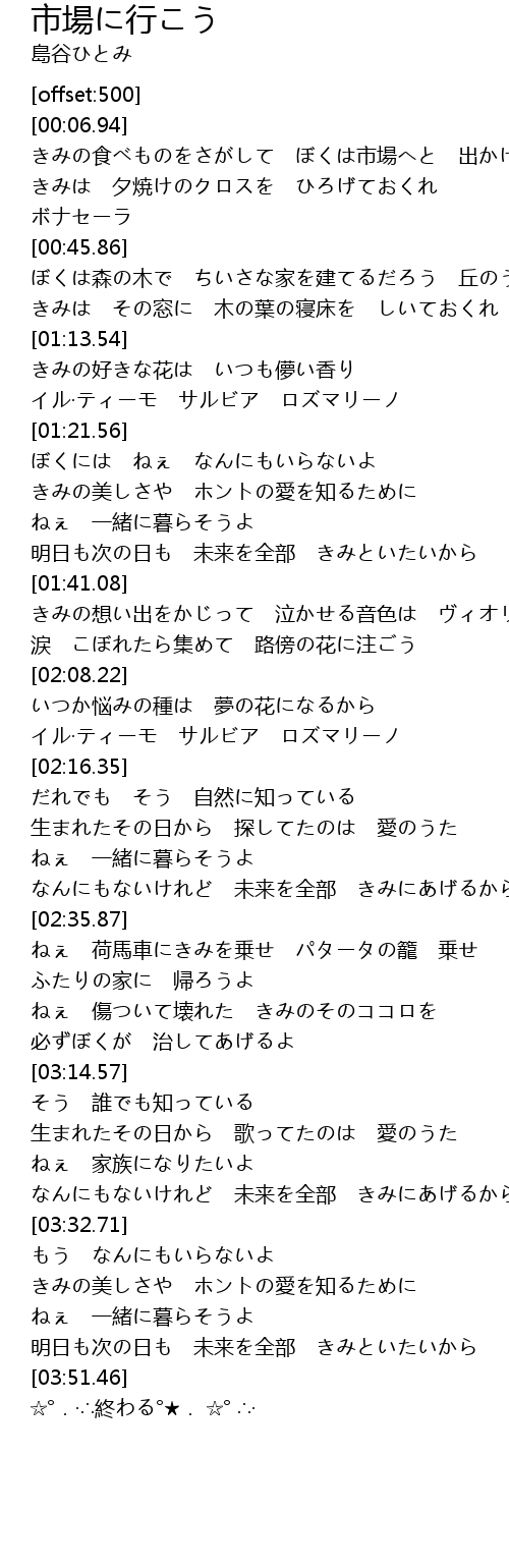 | [00:28.06] | きみの食べものをさがして ぼくは市場へと 出かけよう |