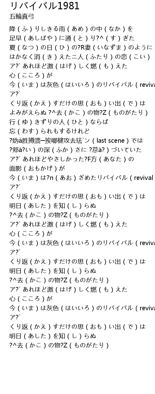 | [02:01.550] | 面影(おもかげ)が 今(いま)は?n(あお)ざめたリバイバル(revival) |