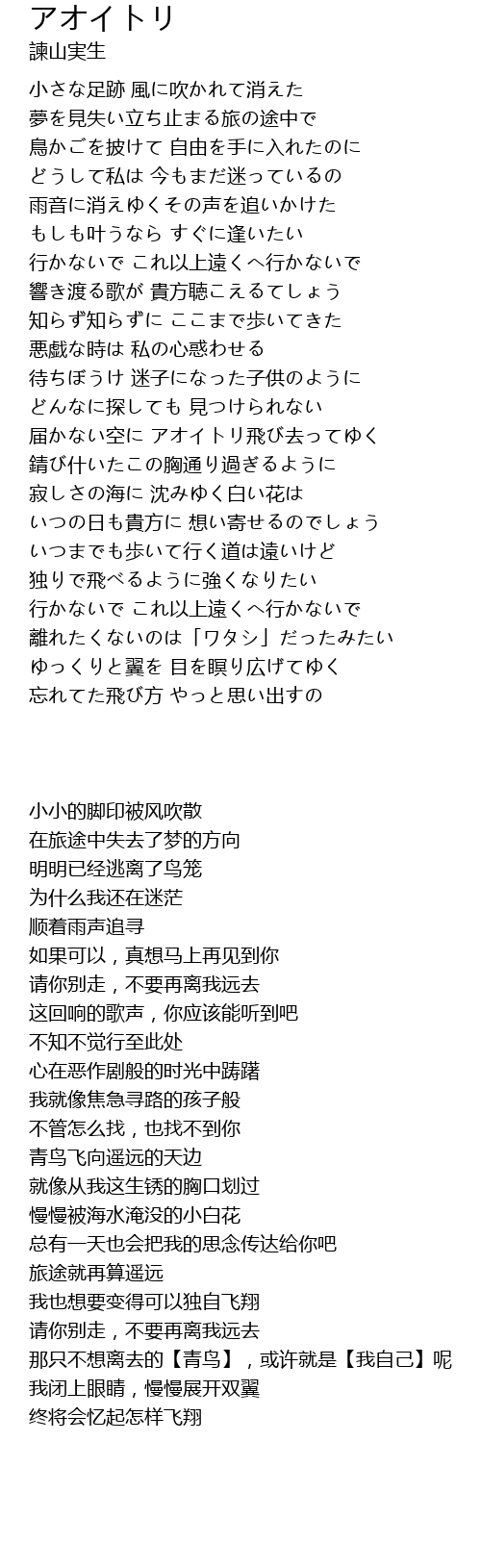 | [03:02.48] | 届かない空に アオイトリ飛び去ってゆく |
