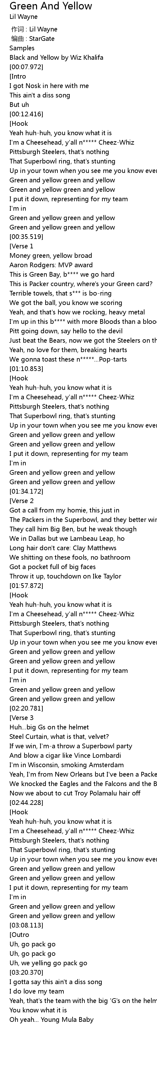 | [02:50.188] | I'm a Cheesehead, y'all n***** Cheez-Whiz |