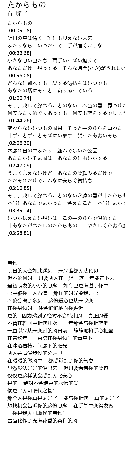 | [03:13.71] | そう、決して終わることのない永遠の愛が「たからもの」 |