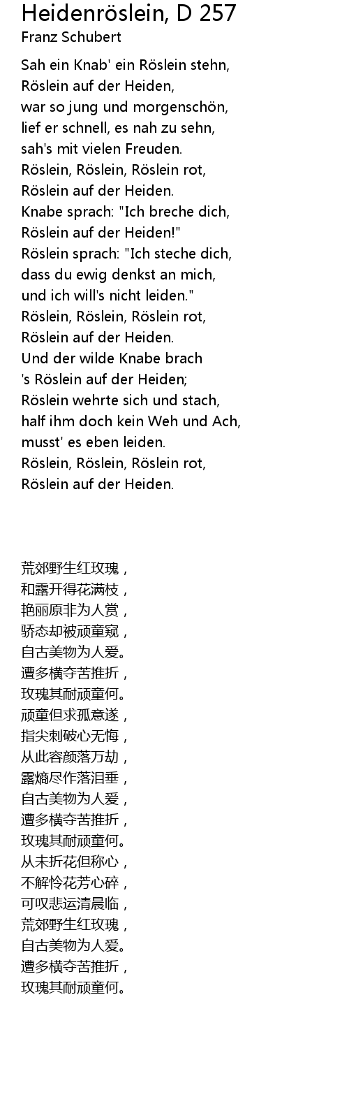 | [00:03.80] | Sah ein Knab' ein Röslein stehn, |