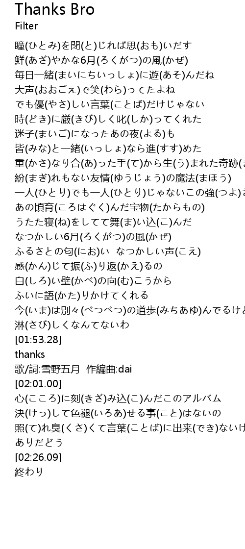 | [01:02.21] | あの頃育(ころはぐく)んだ宝物(たからもの) |
