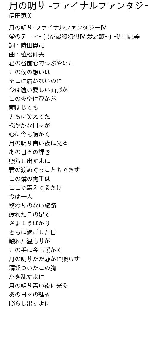 | [00:00.00] | 月の明り-ファイナルファンタジーIV 愛のテーマ-(光-最终幻想IV 爱之歌-)-伊田恵美 |