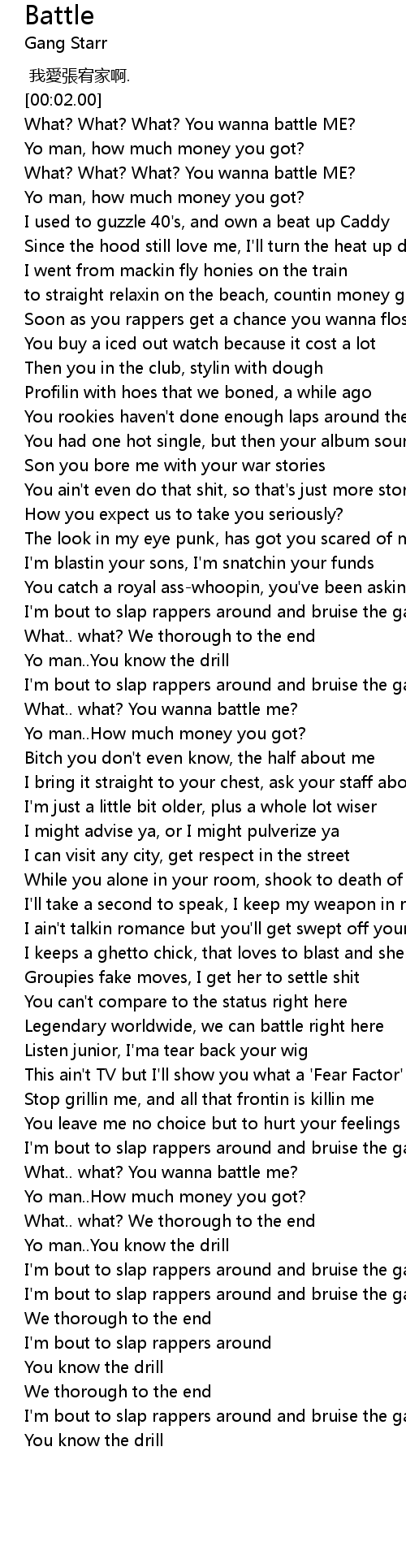 | [00:04.50] | What? What? What? You wanna battle ME? |