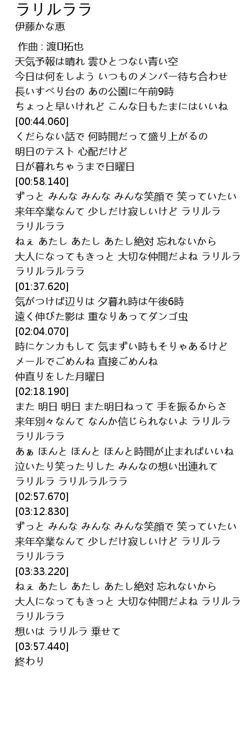 | [03:40.000] | 大人になってもきっと 大切な仲間だよね ラリルラ ラリルララ |