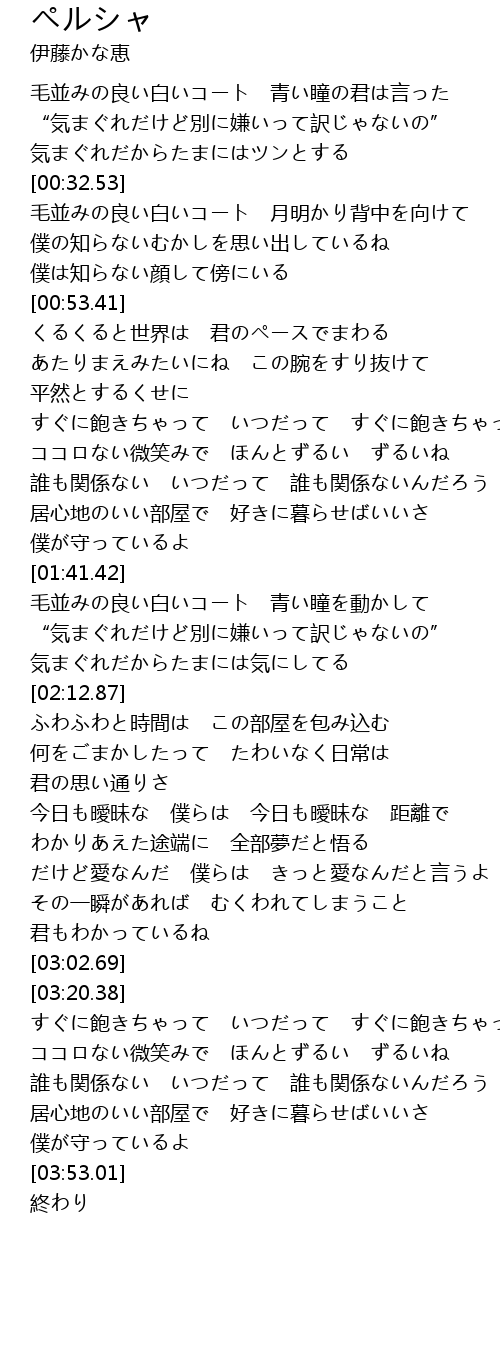 | [01:54.61] | 毛並みの良い白いコート 青い瞳を動かして |