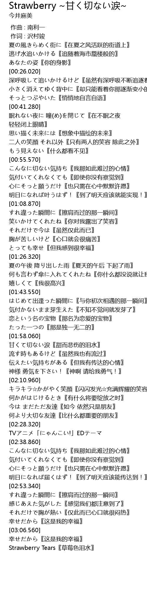 | [03:09.220] | Strawberry Tears cǎo méi sè lèi shuǐ |