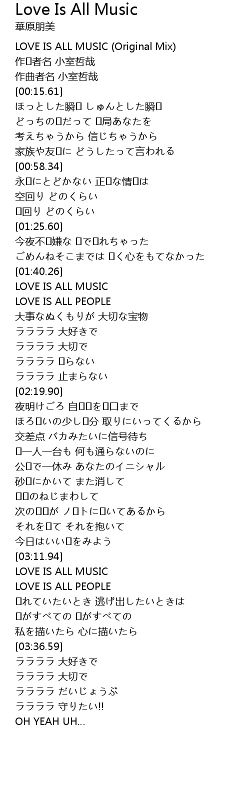 | [00:03.86] | LOVE IS ALL MUSIC (Original Mix) |
