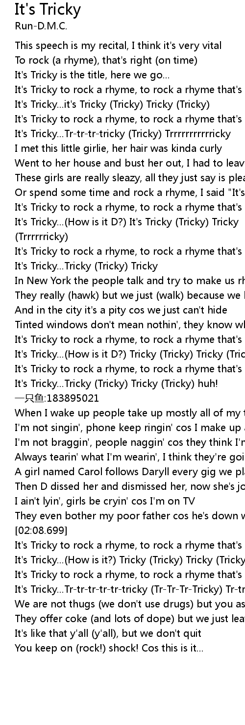| [00:13.280] | It's Tricky...it's Tricky (Tricky) Tricky (Tricky) |