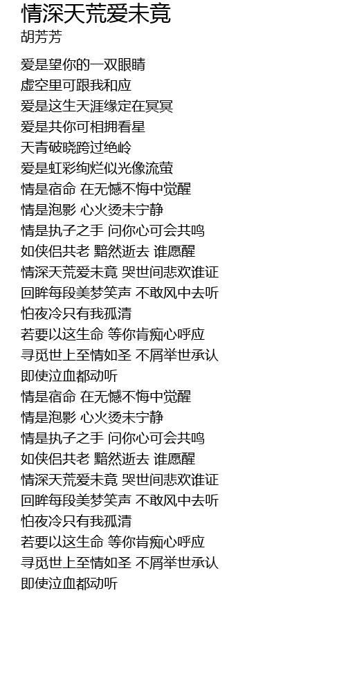 | [03:04.36] | qíng shēn tiān huāng ài wèi jìng kū shì jiān bēi huān shuí zhèng |