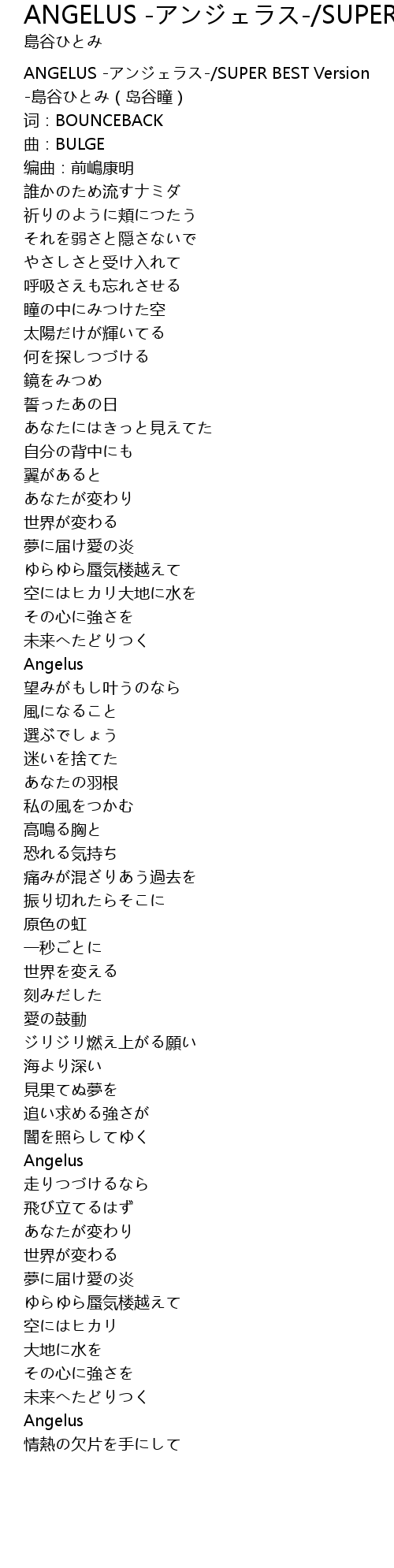 | [00:00.214] | ANGELUS -アンジェラス-/SUPER BEST Version -島谷ひとみ(岛谷瞳) |