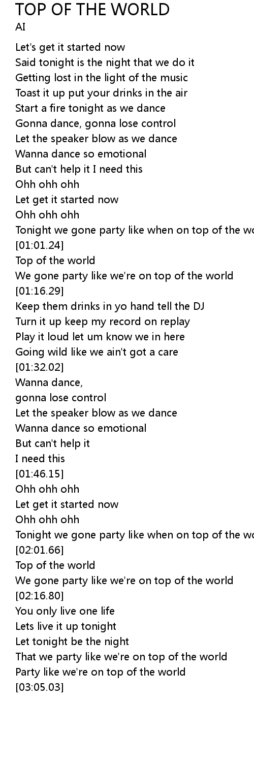 | [00:57.21] | Tonight we gone party like when on top of the world |