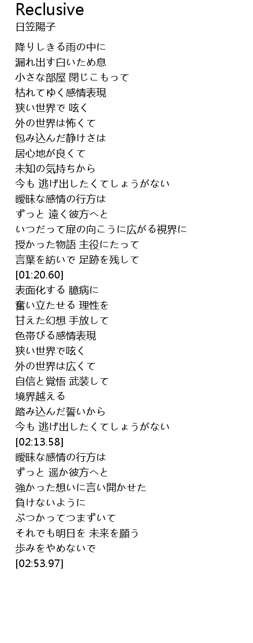 | [01:44.06] | 表面化する 臆病に |