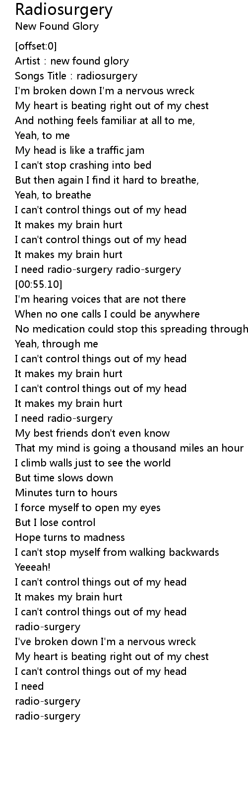 | [00:49.79] | I need radiosurgery radiosurgery |