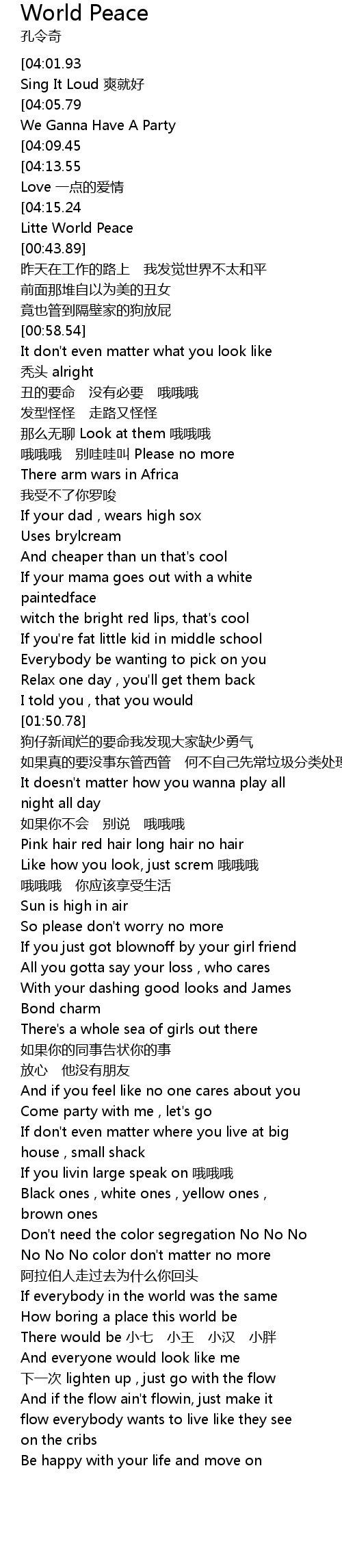 | [04:30.55][04:15.24][03:59.92][03:44.64][02:58.96][01:42.83][00:41.79] | Have A Litte World Peace |